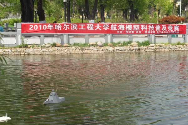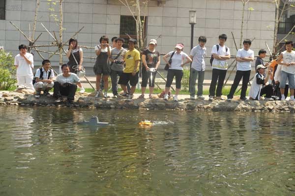 选手们个个热情高涨,娴熟的操作着航海模型在济海湾上穿梭。比赛以人工湖中喷泉为航标,航海模型需绕三个航标运行两圈之后回到起点,用时最短者取胜。经过激烈的角逐,曾思科凭借42秒的优秀成绩率先通过终点获得第一名,第28组选手冯哲奇的作品造型精巧获得本次比赛的最佳美化奖。