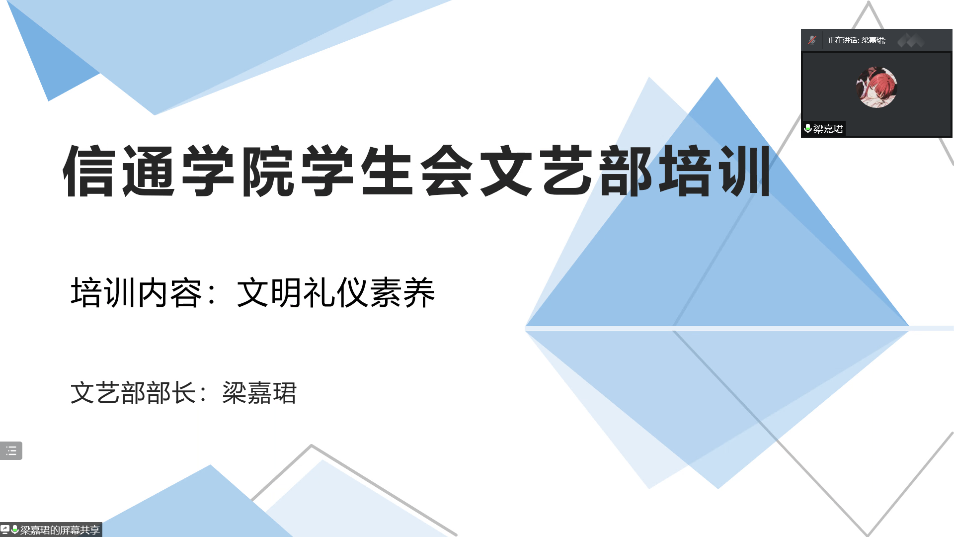 5 | 文艺部 | 梁嘉珺 | 文明礼仪素养 | 4月24日下午2:00至3:00 |