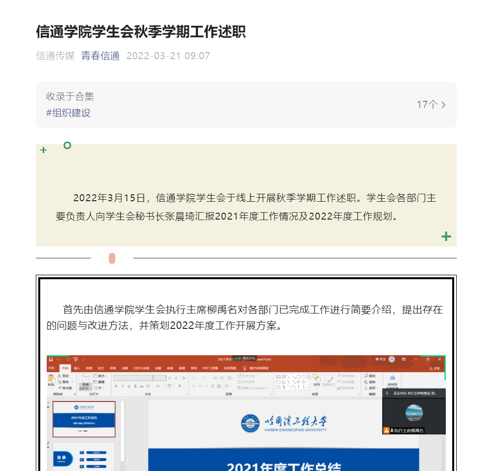 为每次学生会会议做好会议记录,合理安排记录人员,认真记录。在会议召开前协调各部门确定会议主要内容,在会后及时总结并整理会议材料,保证学生会各项工作顺利开展。