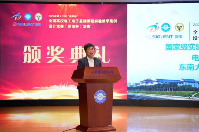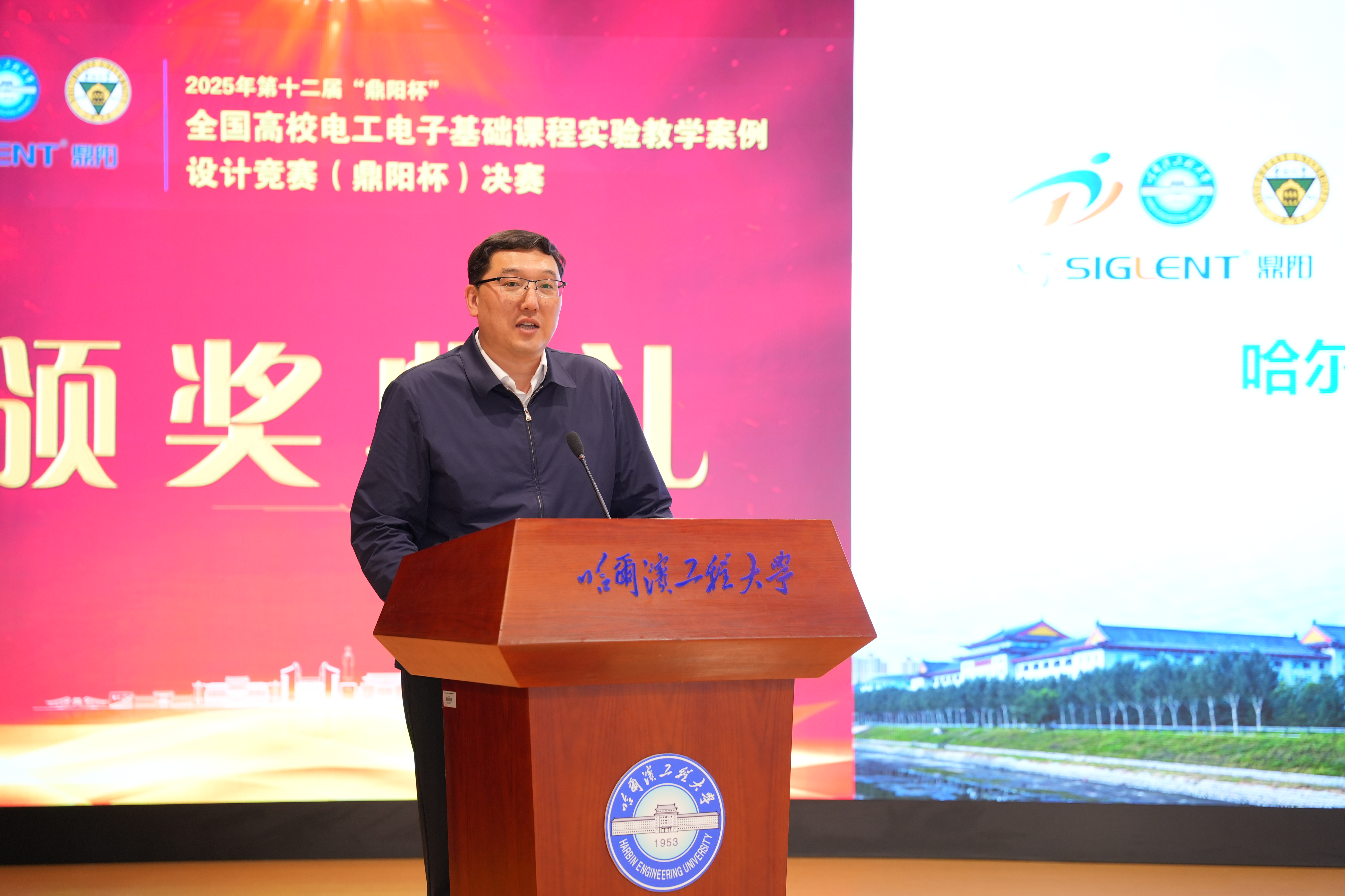 尹航简要介绍了学校的发展建设情况和“三海一核”办学特色。他指出,学校深入贯彻落实习近平总书记来校视察重要讲话重要指示精神,践行“五个坚持、五个注重”办学原则,一体推进教育发展、科技创新、人才培养,持续深化新工科建设,不断提升实验教学质效。他表示,鼎阳杯大赛作为深入交流学习的重要途径,是全国唯一一个为高校电工电子基础课程实验教学教师,提供相互交流、切磋技能的平台,集中展示了全国优秀教师在实验课程内容的重构、教学方法的变革、多学科内容的融入等方面的新经验、新方法、新路径,希望通过本次大赛,各位教师深度交流,不断为电工电子基础实验教学发展带来新活力,为培养适应未来发展的高素质工程人才注入新动能。