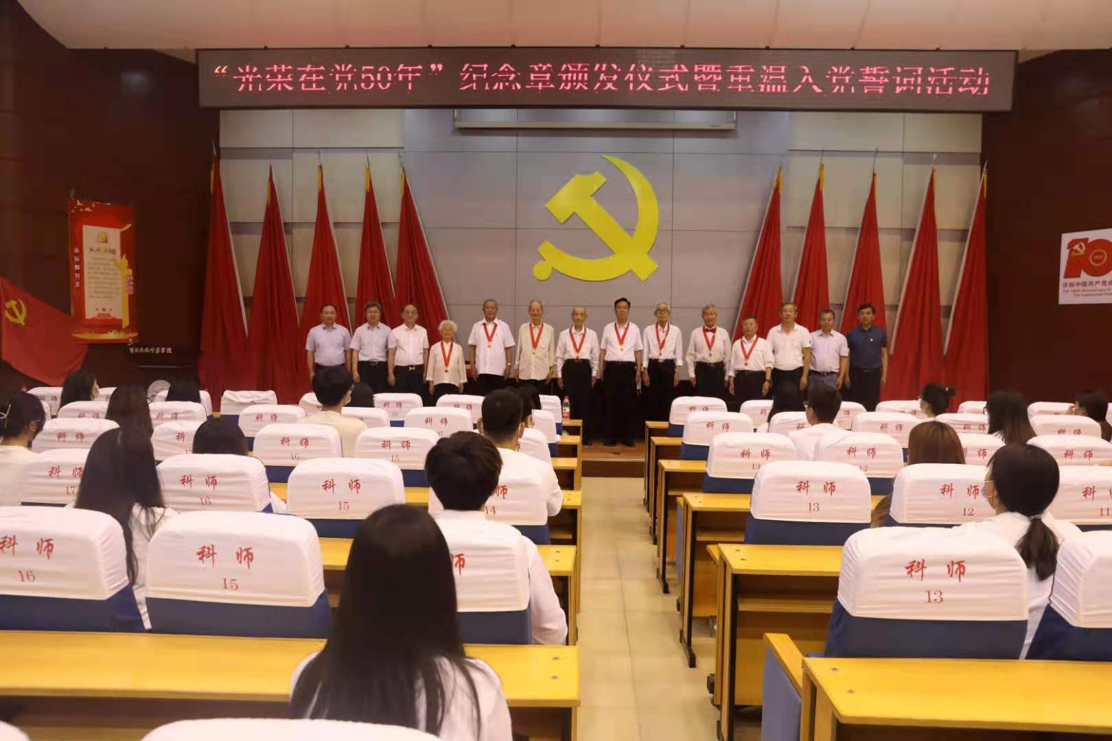 在中国共产党成立100周年即将到来之际,6月23日上午,学校党委组织部、离退休人员党总支和工商管理学院联合举办“光荣在党50年”纪念章颁发仪式暨重温入党誓词活动。校党委书记任民、党委副书记兰耀东出席活动。党委组织部、党委宣传部、离退办、工商管理学院相关负责同志、老党员代表和学生党员代表参加了活动。
