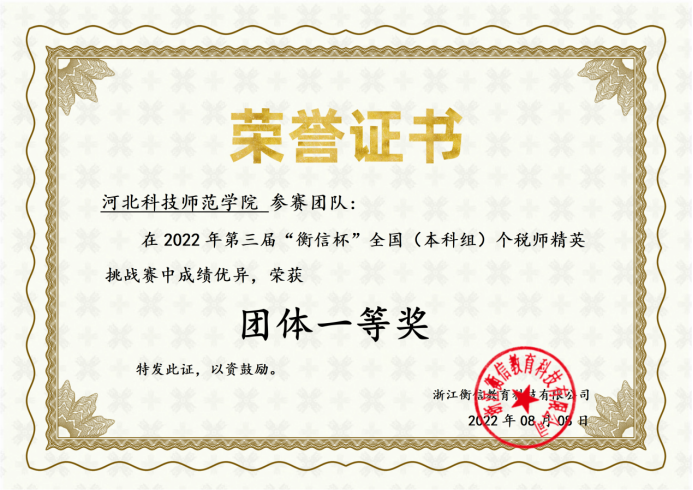 近日,第三届“衡信杯”全国个税师精英挑战赛落幕。大赛自2022年6月12日开赛以来,吸引了来自全国四百多所院校近两万余名学生参赛。经过一个半月的精彩比拼,万象城参赛队伍在张丽英、李国红两位老师的指导下,以优异的成绩斩获本科组团体一等奖,其中胡雨辰同学获得全国个人三等奖。(编辑:孙艳敏 审核:赵宗宝)