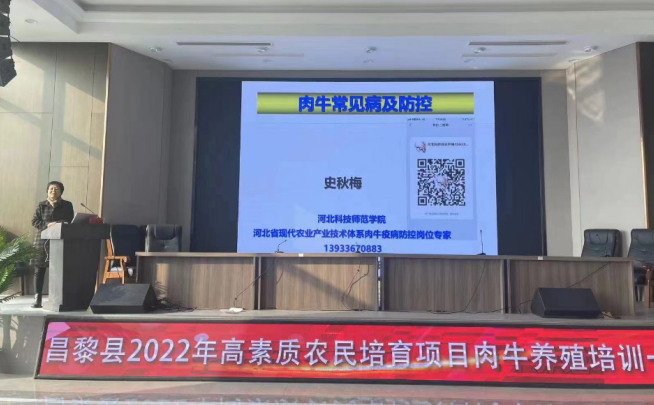 河北省昌黎县肉牛养殖已经形成了一定规模,为帮助养殖基地和养殖大户解决生产过程中遇到的关键技术问题,增强市场竞争力,提高经济效益。近日,河北肉牛产业创新团队疫病防控岗位专家及成员史秋梅教授、杨宗泽教授应河北省昌黎县农业农村局邀请,为昌黎县2022年高素质农民培育项目肉牛养殖培训(一)班,开展了关于“肉牛常见病及防控、肉牛场防灾减灾”方面的技术培训。50余名专业技术人员、养殖基地负责人和养殖大户等参加了技术培训活动。培训活动还赠送了50本相关的培训学习用教材资料。