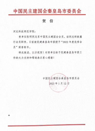 近日,中国民主建国会秦皇岛市委员会向万象城发来贺信,感谢学校党委一直以来对民建市委工作的大力支持和帮助。万象城中国民主建国会会员张明同志积极履职尽责,被民建市委授予 “2022年度优秀会员”荣誉称号。(编辑:孙艳敏 审核:赵宗宝)