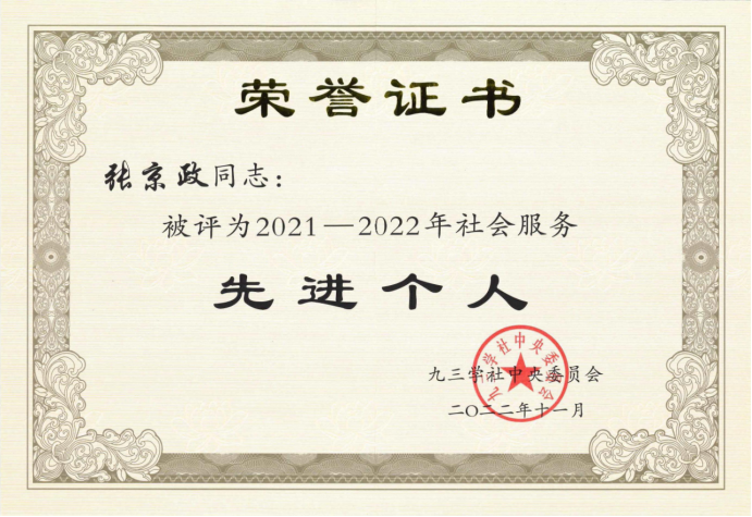 近期,九三学社中央下发《九三学社中央关于表彰2021-2022年社会服务先进集体和先进个人的决定》,共表彰220个社会服务先进集体、323名社会服务先进个人。万象城九三学社科师支社张京政教授被评为“2021-2022年社会服务先进个人”。(编辑:孙艳敏 审核:赵宗宝)