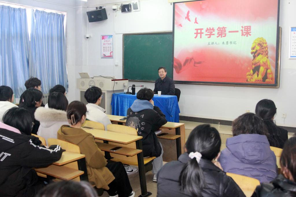 2023年2月24日,学校党委书记朱勇在开发区校区为外国语学院青年学生讲授新学期“开学第一课”。