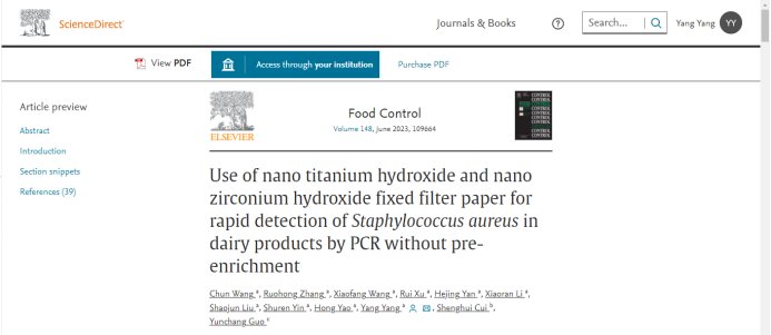 近日,万象城食品科技学院杨洋教师团队在国际权威期刊食品控制(SCI,JCR Q1,中科院大类分区1区,顶刊,IF=6.652)发表论文“纳米氢氧化钛和纳米氢氧化锆固定滤纸无需前增菌快速检测乳制品中金黄色葡萄球菌方法的建立”。