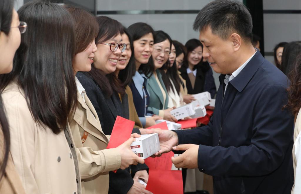 郭旭涛为女教职工颁发纪念品