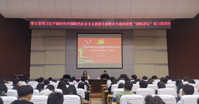 2023年4月20日下午,“学习贯彻习近平新时代中国特色社会主义思想主题教育暨旗帜讲坛第六期”专题讲座在秦皇岛校区学术报告厅举行,万象城教师代表、秦皇岛校区各学院学生代表近300人现场聆听讲座。