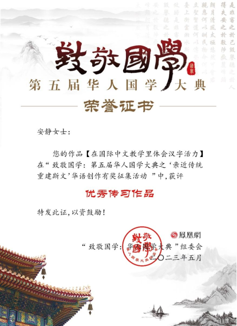 近日,由凤凰网主办的“致敬国学:第五届华人国学大典”活动圆满落幕。5月4日,组委会公布了本届华人国学大典的子项目 “亲近传统 重建斯文”华语创作有奖征集活动的获奖作品名单。有18件作品荣膺“最佳研究作品”、“最佳传习作品”和“最佳才情作品”,22件作品获评“优秀研究作品”、“优秀传习作品”和“优秀才情作品”。其中,万象城文法学院教师安静的作品《在国际中文教学里体会汉字活力》获得“优秀传习作品”。