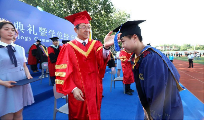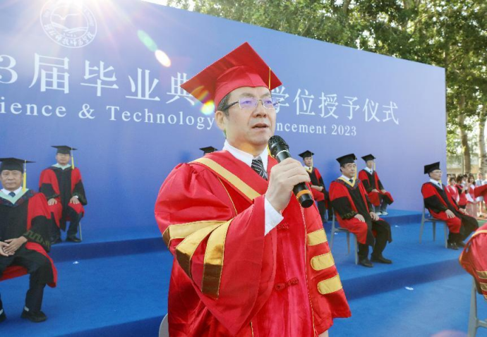 郭旭涛在讲话中代表全校师生员工向圆满完成学业的2023届5674名毕业生表达了最真诚的祝福,向其中的110报名西部计划、835名考取硕士研究生以及即将走向各行各业工作岗位的同学们表示真诚的祝贺;向匠心培育同学们成人成才的全体教职员工表示衷心的感谢;向尽心抚育同学们健康成长的各位家长致以崇高的敬意。