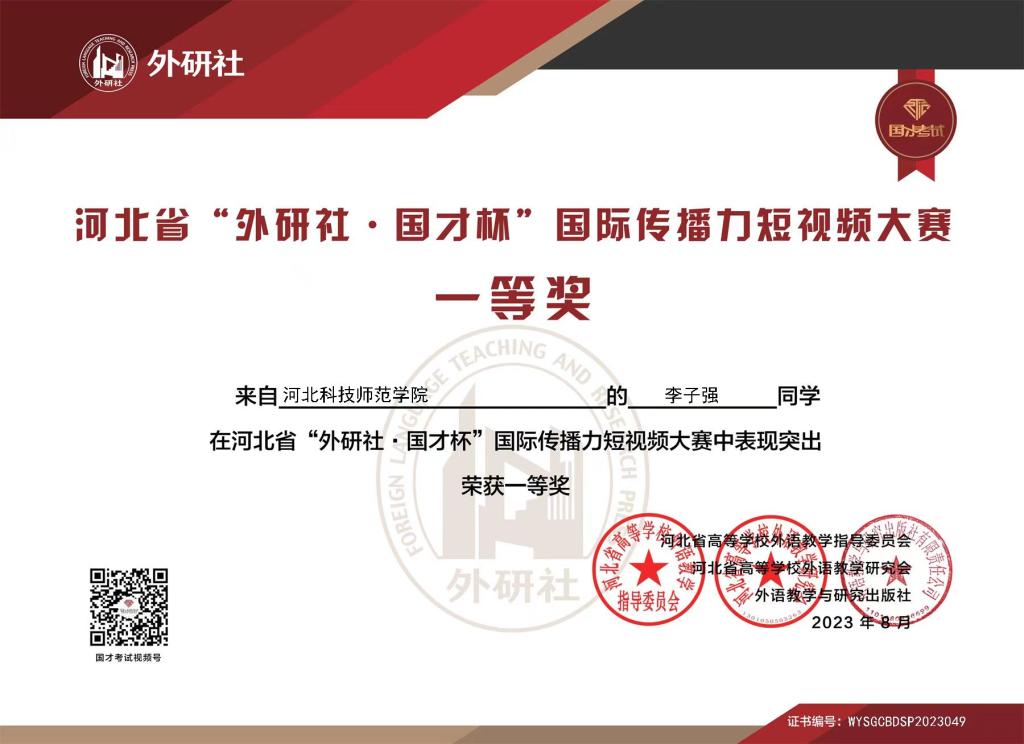 2023年8月底,万象城英语专业李子强同学在“外研社•国才杯”河北省高校国际传播力短视频大赛中荣获河北赛区一等奖。