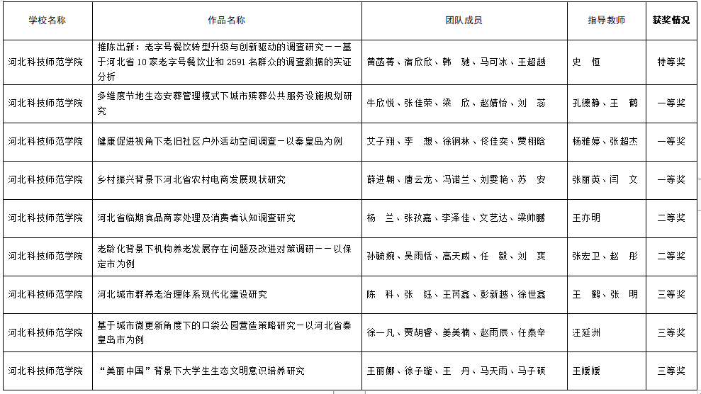 物理系黄菡菁同学等的《推陈出新:老字号餐饮转型升级与创新驱动的调查研究———基于河北省10家老字号餐饮业和2591名群众的调查数据的实证分析》作品喜获特等奖,指导教师史恒获“优秀指导教师”荣誉称号;城市建设学院牛欣悦同学等的《多维度节地生态安葬管理模式下城市殡葬公共服务设施规划研究》等3件作品获得一等奖;财经学院杨兰同学等的《河北省临期食品商家处理及消费者认知调查研究》等2件作品获得二等奖;化学工程学院王丽娜同学等的《“美丽中国”背景下大学生生态文明意识培养研究》等3件作品获得三等奖。