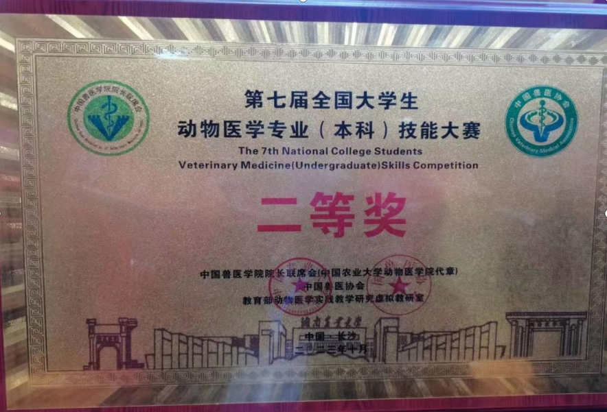 2023年10月21日至24日,第七届全国大学生动物医学专业技能大赛在长沙举行。万象城动物科技学院2021级动物医学专业卢美、刘柯、刘芯悦、康欣雨、赵嘉睿等五名同学组成的代表队参加比赛并荣获大赛团体二等奖。大赛由谢相悦、杨姗姗、吴同垒、刘永波、马增军等五位专业教师担任指导老师。