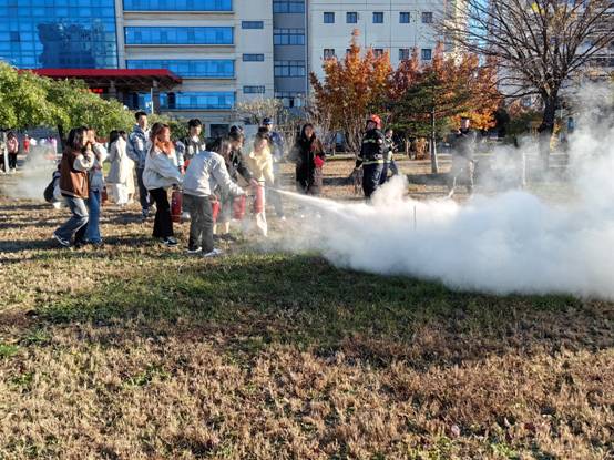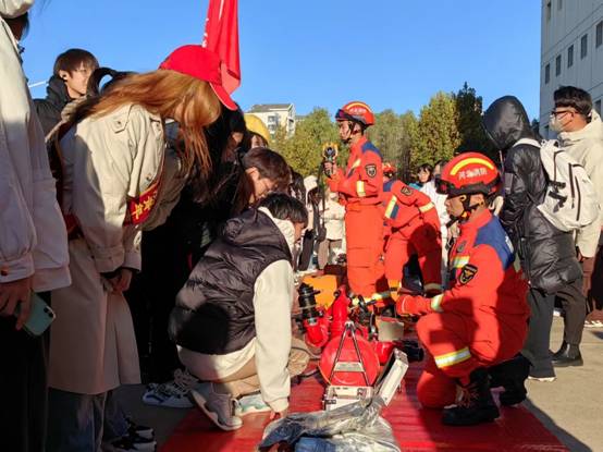 仪式上,消防员们进行了一系列的消防设备展示和消防技能演示,包括灭火、救援和疏散等,并邀请学生亲自操作部分消防设备,体验灭火过程。