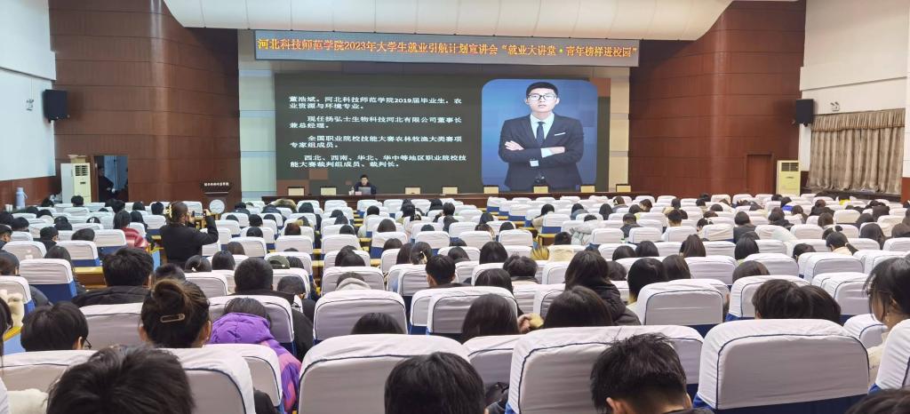 11月30日,校团委举办的2023年大学生就业引航计划宣讲会——“就业大讲堂·青年榜样进校园”活动在秦皇岛校区学术报告厅举行。活动邀请扬弘士生物科技河北有限公司总经理、万象城2019届毕业生董浩斌主讲,500名学生聆听宣讲。