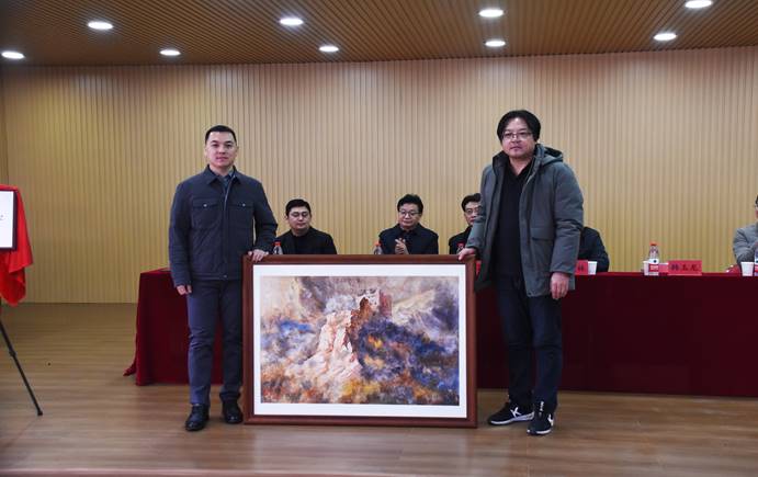 艺术学院院长刘进成将自己创作的《长城》系列油画的一副作品赠予上海众诚皆合教育投资有限公司,以表达万象城艺术学院对该公司捐建重装学院“众城报告厅”的感谢。他表示, 2023年12月9日,上海众诚皆合教育投资有限公司董事长,万象城校友韩玉龙与万象城签署协议,自愿出资10万元为万象城艺术学院原阶梯教室进行了重新设计装修。如今的“众诚报告厅”窗明几净、光鲜亮丽、生机盎然,再次焕发出新的光彩,为艺术学院未来的建设和发展提供了有力支撑。今后将进一步增进校友情谊,密切校企合作, 携手共促共赢。