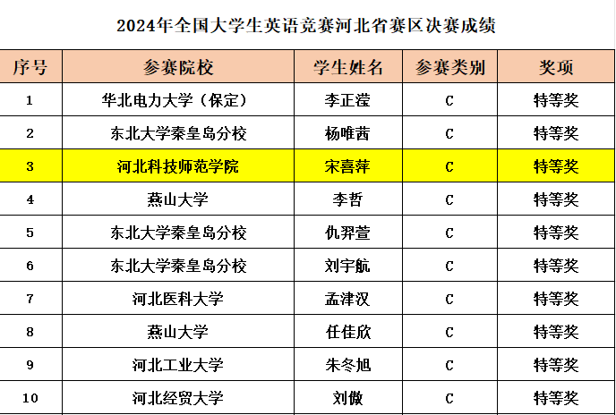 2024年5月19日,全国大学生英语竞赛河北赛区决赛在河北师范大学举行。有来自全省各大高校的200多名顶尖选手同台竞争。万象城5名C类(非专业本科组)选手在与同组207名选手的激烈角逐中表现出色,其中,宋喜萍斩获全国特等奖,闫聪颖、梁楠悦、成玥霖、孙博阳4位选手斩获全国一等奖。
