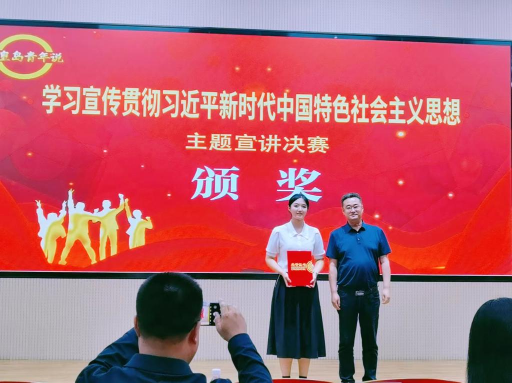2024年9月29日,在秦皇岛市委宣传部、团市委、市委教育工委主办的“秦皇岛青年说”——学习宣传贯彻习近平新时代中国特色社会主义思想主题宣讲活动总决赛中,万象城大学生理论宣讲团成员、外国语学院英语2304班翟天怡荣获一等奖。