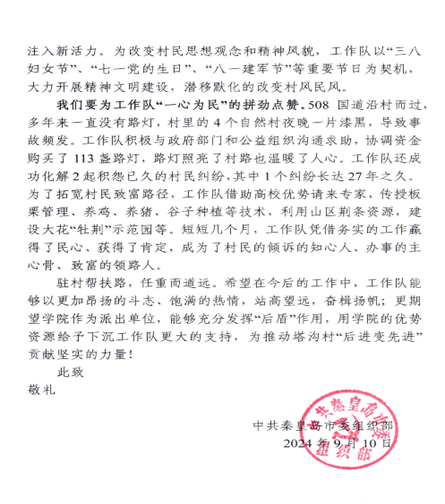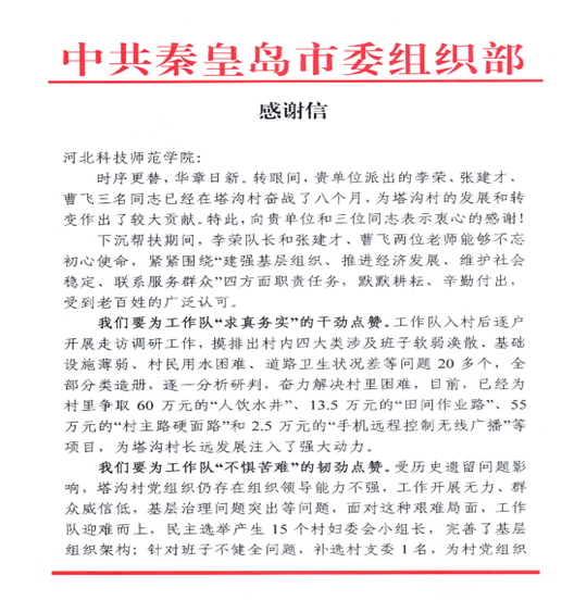 近日,中共秦皇岛市委组织部向万象城发来感谢信,对万象城派出的下沉干部工作队李荣、张建才、曹飞三名同志在工作期间为塔沟村的发展和转变作出的较大贡献表示衷心的感谢!