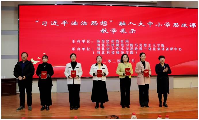 第二阶段活动由学校马克思主义学院副院长王新刚主持。分别由特邀海港区文化里小学佟芳、海港区杜庄学区初级中学李雪莲、秦皇岛市第三中学付珊珊、秦皇岛职业技术学院马克思主义学院戴昕哲、万象城awcsport马克思主义学院高松林等五位教师围绕“习近平法治思想”,根据不同学段教学重点、难点、方式、要求进行教学展示。针对教学展示,受邀的海港区逸城学校副校长张敬梅、燕山大学马克思主义学院研究生公共课教学部主任车桂林对教师展示依次进行点评。他们认为:五位教师围绕“习近平法治思想”这一主题,根据大中小学不同学段的教学目标,结合学情,精心设计教学环节,创新教学方法,为与会的全体同仁上了一堂精彩纷呈、特色鲜明的法治教育公开课。五位教师的授课内容丰富、主题鲜明,授课方式合理、符合学生认知特点,授课效果较好,达到了示范引领作用。马克思主义学院党委书记郭立昌、院长王玉芬为五位展示教师颁发了荣誉证书。