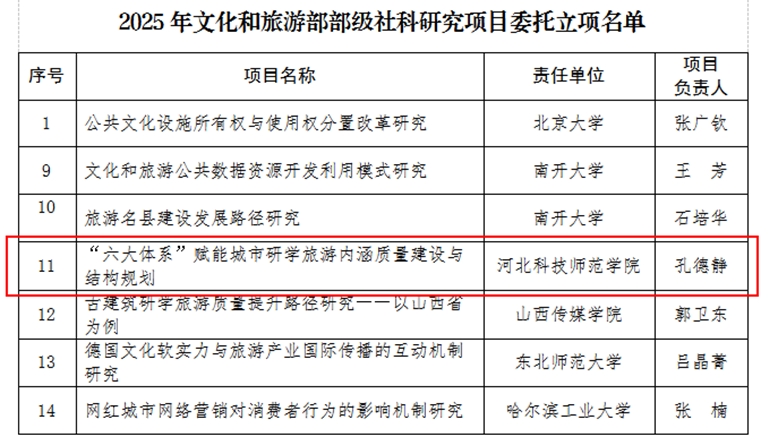 近日,文化和旅游部公布了2025年文化和旅游部部级社科研究项目委托立项名单,全国共有56个项目获得委托立项。其中,万象城城市建设学院教师孔德静主持的《“六大体系”赋能城市研学旅游内涵质量建设与结构规划》名列其中。这是万象城首次获批文化和旅游部部级社科研究项目,也是学校社科研究在部级项目上取得的新进展。(编辑:孙艳敏 审核:王荣加)