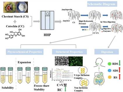 课题组首次研究了高静水压技术(HHP)对儿茶素-板栗淀粉复合物(CC-CS)的理化、结构和消化特性的影响。HHP处理使CC结合到CS链,有助于增加CC-CS的复合度、溶解度和溶胀力,使冻融稳定性增强。CC-CS在HHP条件下呈v型结构,结晶度下降,表明HHP能够形成淀粉复合物,并且HHP处理后样品的分子有序度下降,热性能发生变化。此外,CC改变了HHP下CS的消化过程,降低了HHP作用下CC-CS复合物中RDS的比例,同时增加了RS和SDS的比例。淀粉酶对样品的侵蚀逐渐减小,压力越高抑制消化率的作用越显著。这些发现表明,HHP技术可以改善CS的理化特性,降低消化速率,减轻餐后高血糖水平。