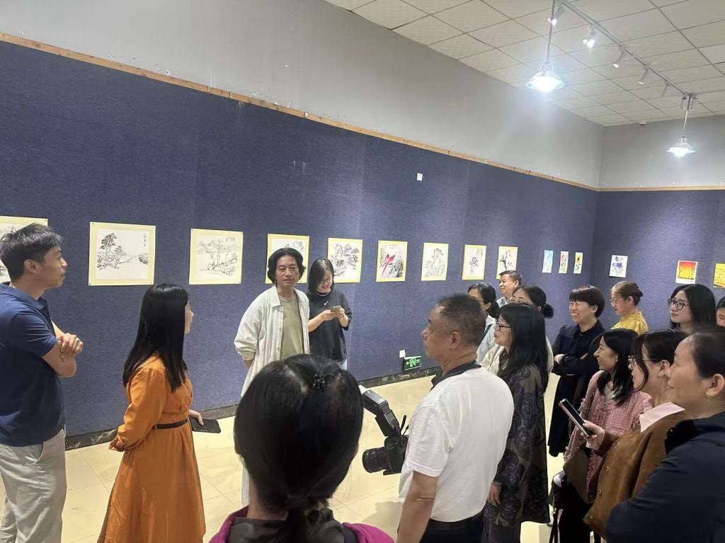 艺术楼展厅内,学员们在12天培训中完成的国画、水彩、陶艺、扎染等实践创作作品整齐陈列,既有对传统水墨意境的现代诠释,也有对民间手工艺的创新表达。艺术学院院长刘进成教授、副院长井庆昂教授逐一点评作品,从构图技法到文化内涵,从教学实践的可迁移性到学生审美引导的切入点,为学员们带来了一场“沉浸式”艺术指导课。