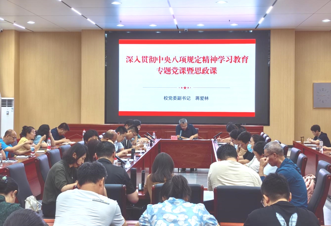 6月27日,在中国共产党成立104周年之际,校党委副书记蒋爱林在深入贯彻中央八项规定精神学习教育讲专题党课暨思政课上强调,要深入学习贯彻习近平总书记重要论述,进一步增强贯彻执行中央八项规定精神的自觉性和主动性,巩固发展风清气正的政治生态,深入贯彻中央八项规定精神是新时代党的作风建设的重要抓手,作风建设新成效为推进中国式现代化提供了坚强政治保障,必须一以贯之以优良作风凝心聚力、干事创业,推动学校高质量发展。