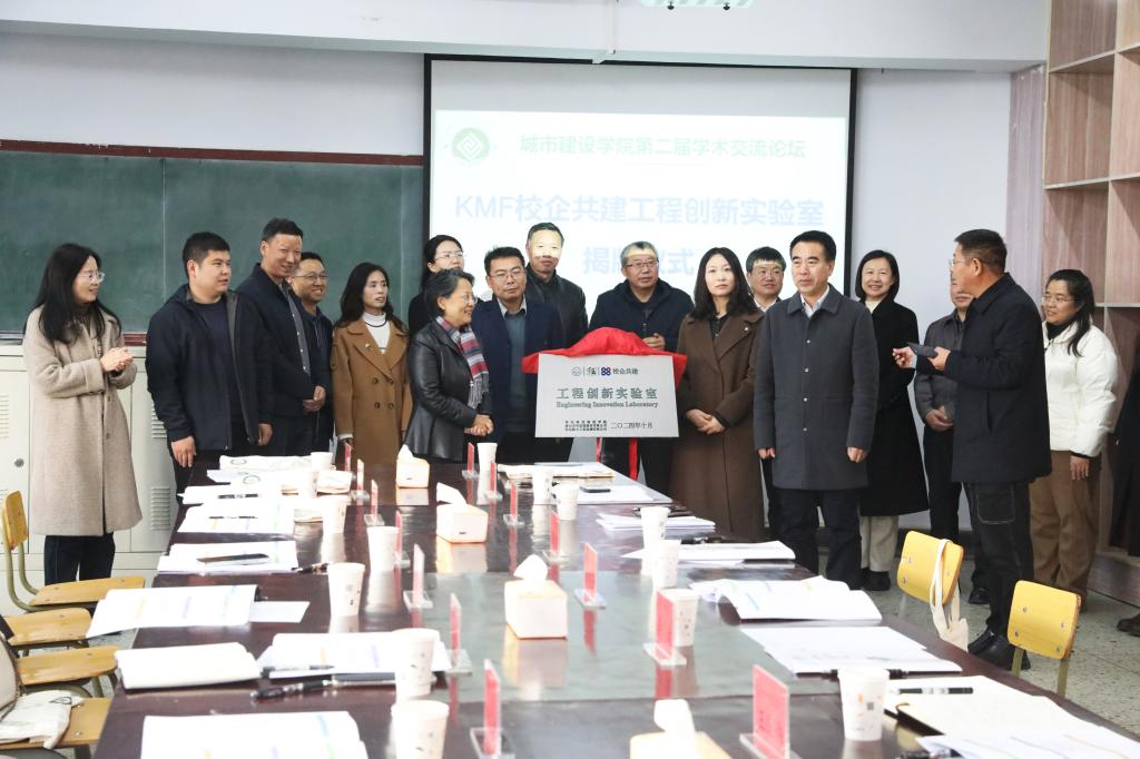 副校长杨越冬、副校长刘荣昌与两位企业代表共同为“KMF校企共建工程创新实验室”揭牌,标志着城市建设学院、唐山市可迈福建材有限公司、河北新丰工程检测有限公司三方共建的科研与人才培养实体平台正式落地。