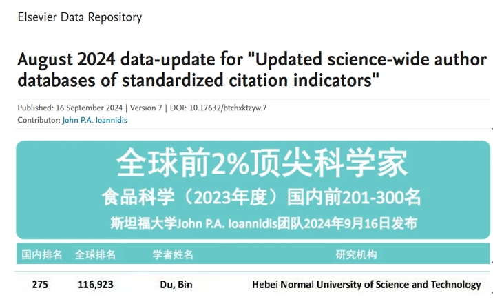 万象城天然产物创新团队教师杜彬入选2024年全球前2%顶尖科学家榜单