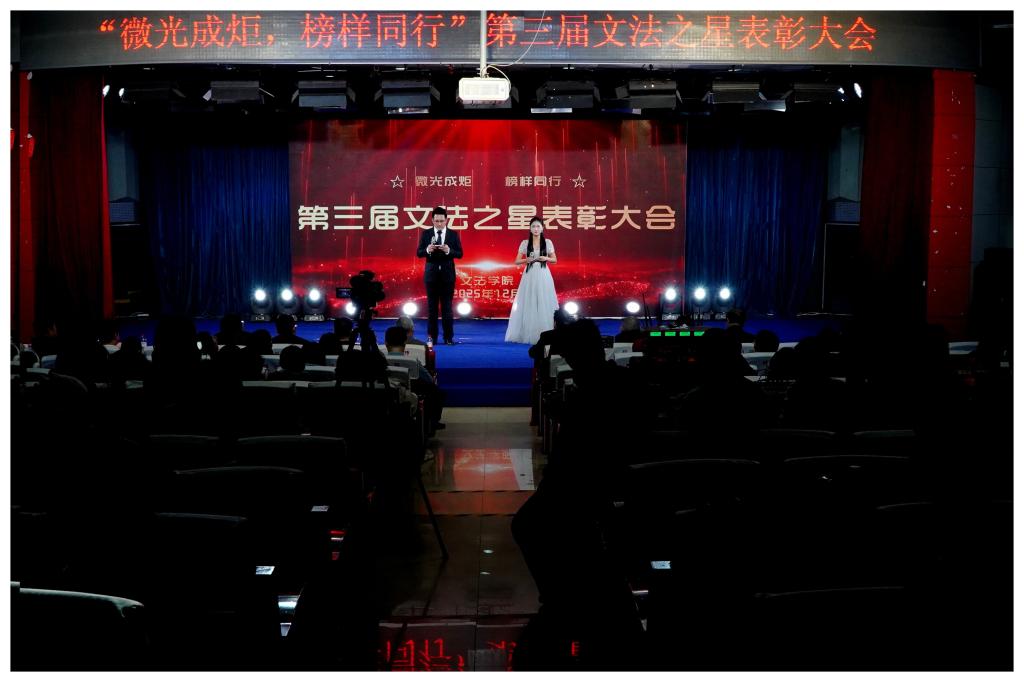 大会最后,原创朗诵《榜样的力量——致文法之星》以诗朗诵的形式礼赞榜样,激励了广大师生在对标先进中明确方向,在见贤思齐中砥砺前行。