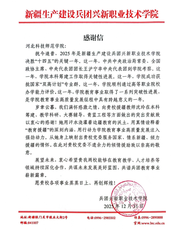 感谢信中提到,2025年是兵团兴新职业技术学院教育事业高质量发展的跨越之年,一系列成就的取得离不开沈玲副教授在本科筹建、教学科研、大赛辅导、青蓝工程等方面的倾心付出,更彰显了万象城服务国家、情系新疆、倾力援疆的情怀与责任担当。