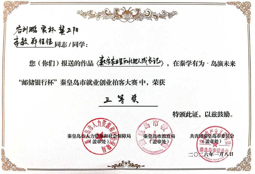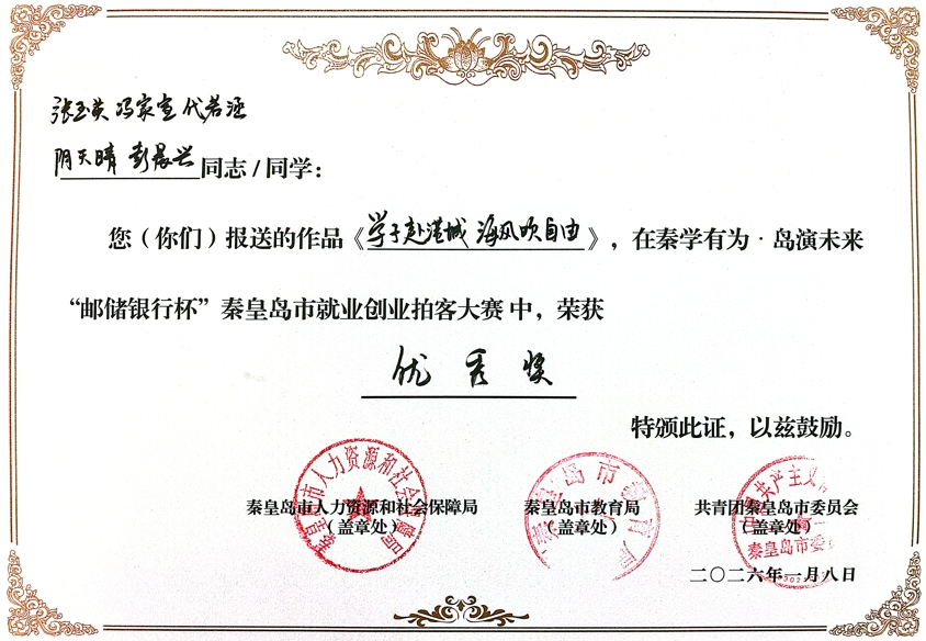 1月8日,由秦皇岛市人社局、市教育局和团市委联合举办的“秦学有为·岛演未来——‘邮储银行杯’秦皇岛市就业创业拍客大赛” 圆满落幕。化工学院学子凭借出色的创意与实践能力,荣获三等奖、优秀奖各1项。