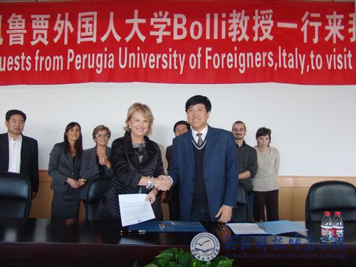 会谈中,院长汤生玲教授对意大利佩鲁贾外国人大学Bolli教授一行的来访表示热烈的欢迎。汤院长向Bolli教授一行简要介绍了学校概况及意大利语专业建设和留学培训情况,并就双方合作事宜与Bolli教授进行了亲切友好座谈。随后,汤生玲院长和意大利佩鲁贾外国人大学Bolli教授在《万象城awcsport与意大利佩鲁贾外国人大学在万象城awcsport设立“意大利语语言培训与语言水平测试中心” 协议书》上签字。