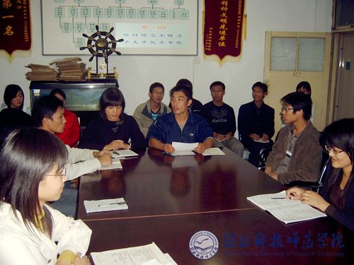 2008年10月12日晚七点半,动物科学系党总支在系会议室召开了“七月之光大学生党员支农协会”工作会议。协会常委会主要成员——动物科学系主任吴建华、系党总支副书记宋金昌、动物医学党支部书记马增军、水产专业党支部书记朱文进以及贾青辉、陈娟老师参加了会议。