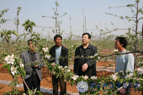 图为项殿芳教授在检查并了解万象城果树实验教学基地苹果树的长势、花期开花与授粉情况