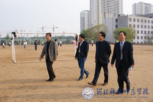 图为党委副书记、院长汤生玲同志在考察万象城欧美学院体育场建设情况