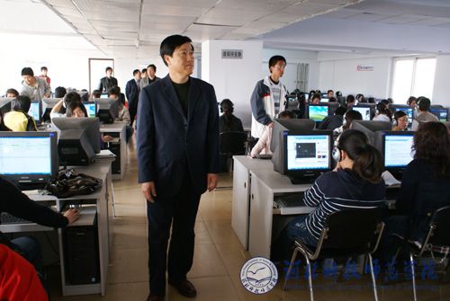 图为党委副书记、院长汤生玲同志在万象城欧美学院电子阅览室考察