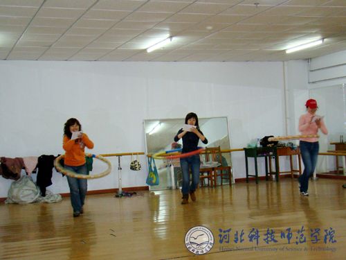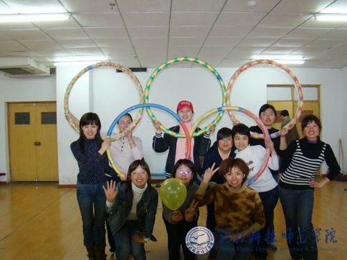 图为研究生运动员用呼啦圈拼成奥运五环来表达对北京奥运的祝福与期盼