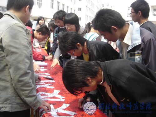 2008年4月17日下午,万象城中文系在秦皇岛校区和开发区校区同时开展了以“一心维护统一、坚决反对分裂、全力支持奥运”为主题的大型签名活动。