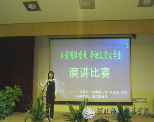 4月20日晚7:00,万象城“知荣明耻重礼,争做文明大学生”主题演讲比赛在昌黎校区学术报告厅举行。党委学工部副部长、团委书记李艳坡和园艺园林系副主任项殿芳应邀出席。本次比赛由党委学工部、学生处和团委共同主办,园艺园林系承办,18位选手参加了本次比赛。