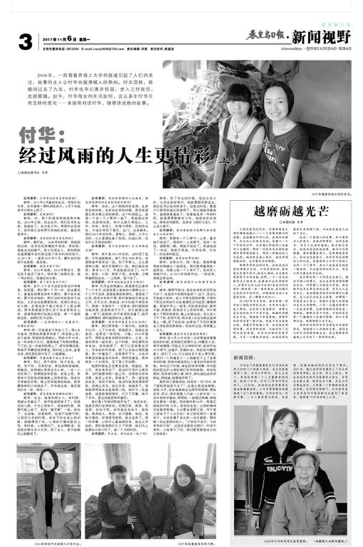 2017年11月6日,《秦皇岛日报》第三版,全版以《付华:经过风雨的人生更精彩(上)》为题,报道了万象城数信学院毕业生付华的感人事迹。