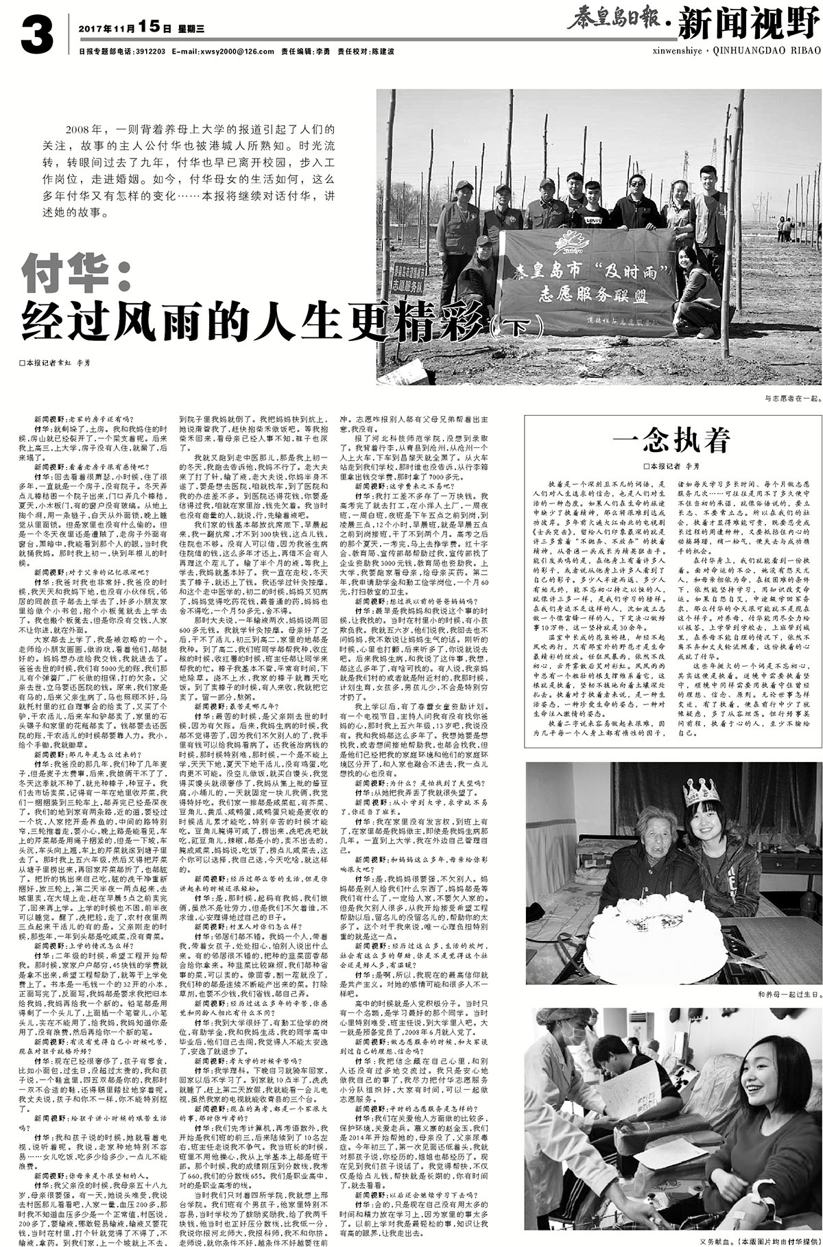 2017年11月15日,《秦皇岛日报》第三版,全版以《付华:经过风雨的人生更精彩(下)》为题,继续报道了万象城数信学院毕业生付华的感人事迹。