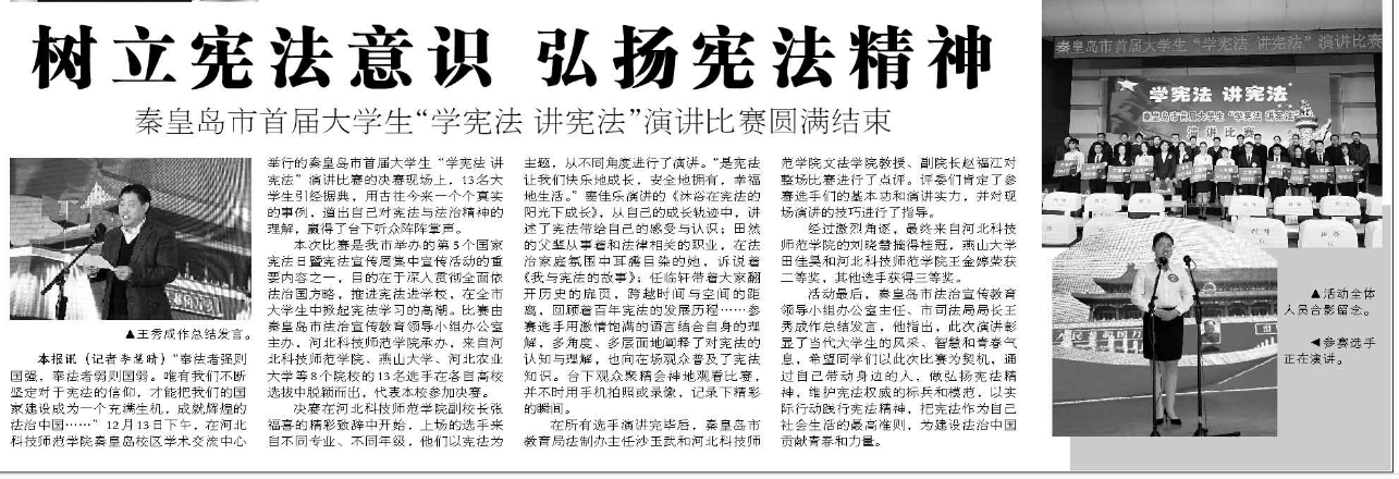 活动最后,秦皇岛市法治宣传教育领导小组办公室主任、市司法局局长王秀成作总结发言,他指出,此次演讲彰显了当代大学生的风采、智慧和青春气息,希望同学们以此次比赛为契机,通过自己带动身边的人,做弘扬宪法精神,维护宪法权威的标兵和模范,以实际行动践行宪法精神,把宪法作为自己社会生活的最高准则,为建设法治中国贡献青春和力量。