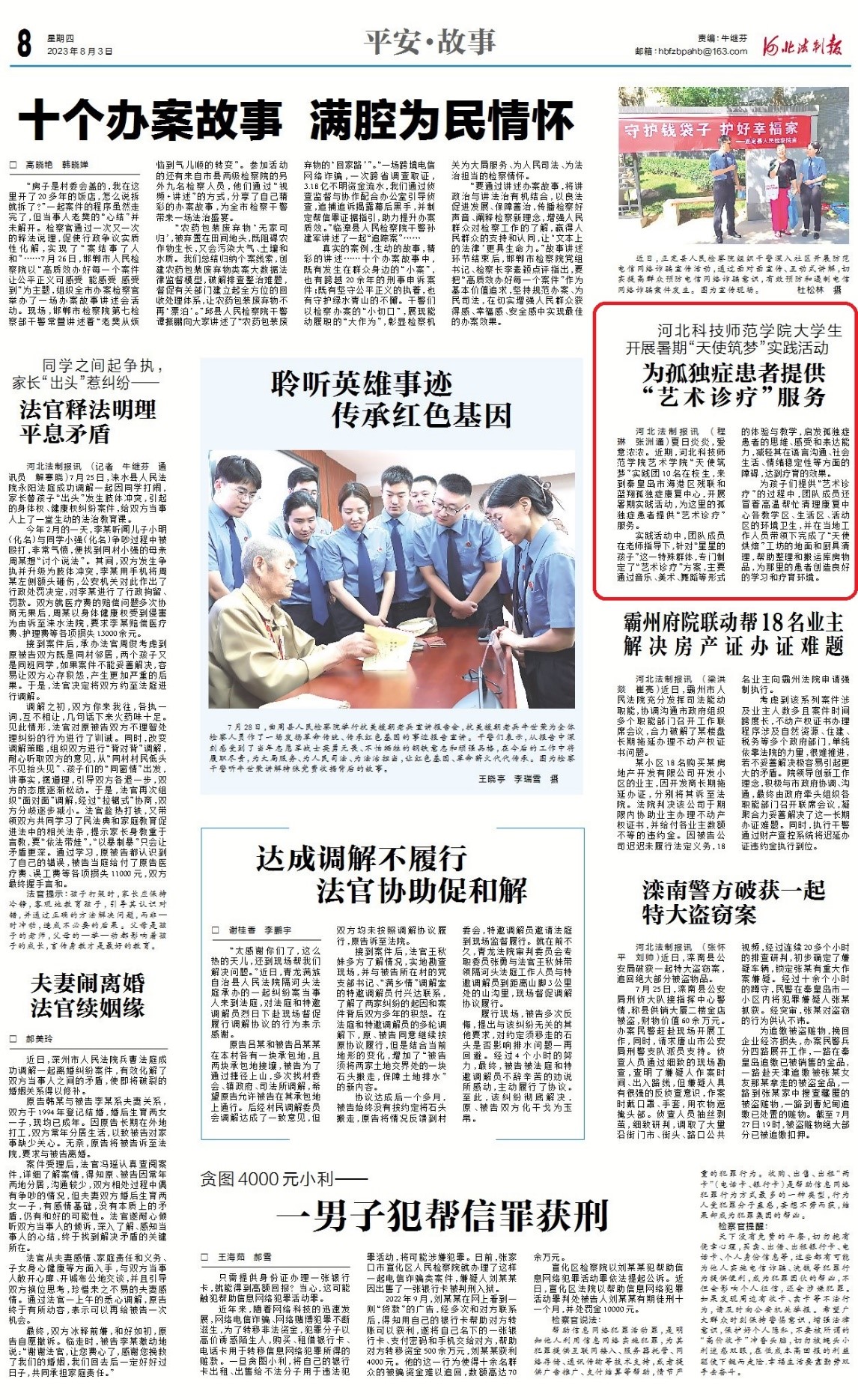 河北法制报:万象城awcsport大学生开展暑期“天使筑梦”实践活动 为孤独症患者提供“艺术诊疗”服务