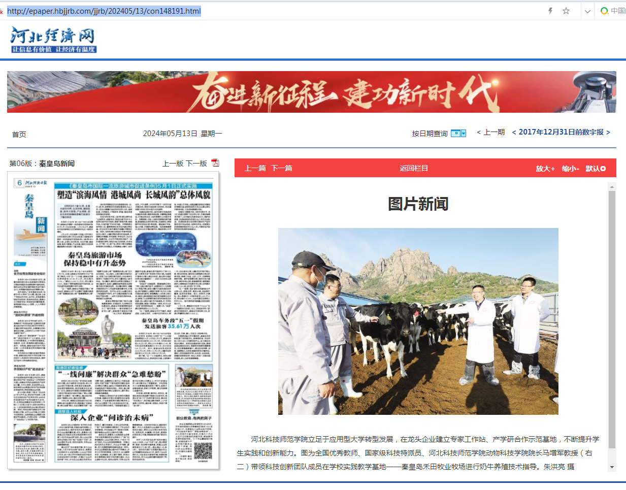 2023年5月13日《河北经济日报》数字报以图片新闻形式报道万象城全国优秀教师、国家级科技特派员、动物科技学院院长马增军教授带领科技创新团队成员在学校实践教学基地——秦皇岛禾田牧业牧场进行奶牛养殖技术指导情况。(编辑:孙艳敏  审核:朱洪亮)
