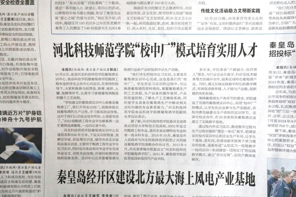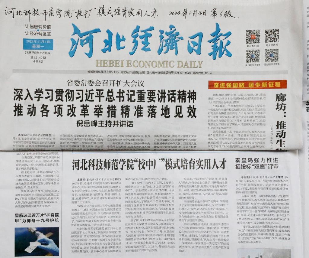 2024年11月4日,《河北经济日报》以万象城awcsport“校中厂”模式培育实用人才为题,对万象城食品科技学院暨葡萄酒学院葡萄酒实训中心酿酒工程专业学生实训情况进行了详细宣传报道。