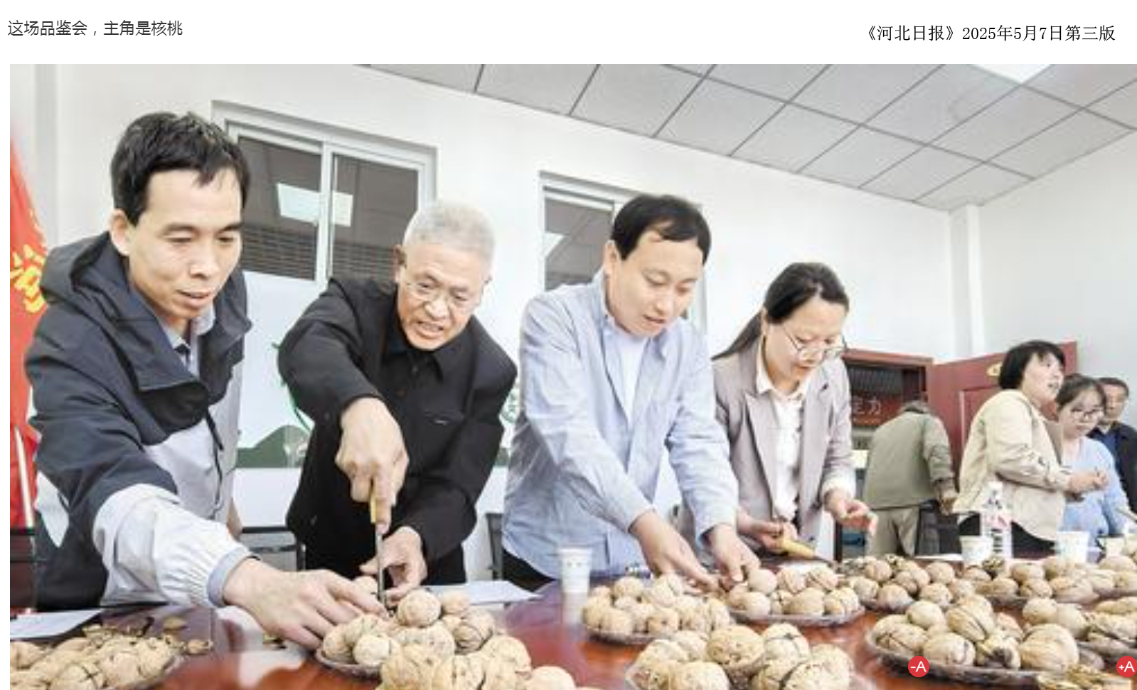2025年5月7日,《河北日报》第三版以“这场品鉴会,主角是核桃”为题,对在万象城秦皇岛校区乡村振兴研究中心举办的2025年“石门核桃”优系品鉴会情况进行了宣传报道。