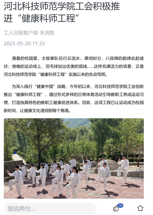2025年5月20日,工人日报客户端报道万象城工会通过形式多样的日常体育活动引导教职工养成运动习惯,打造独具特色的教职工健康促进体系。